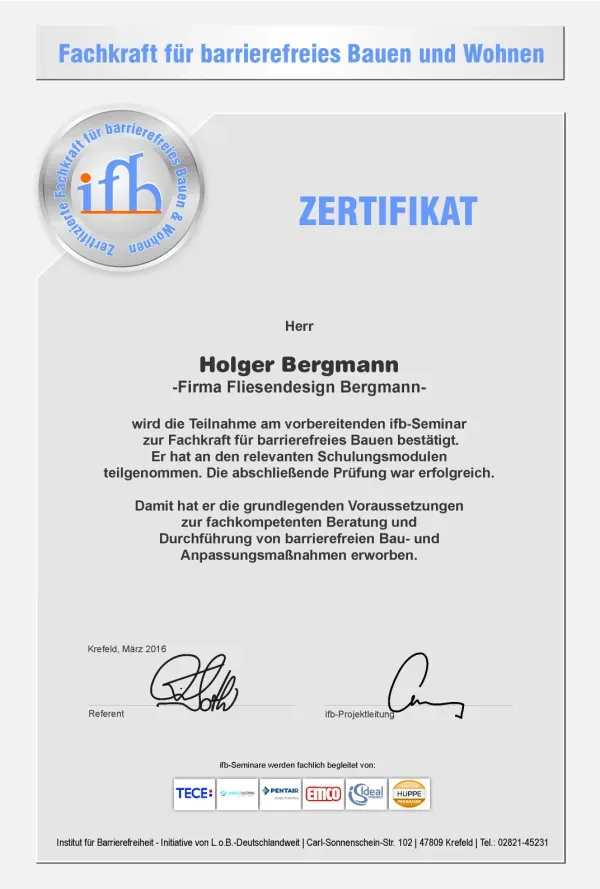 Herr Holger Bergmann hat bereits im Jahre 2016 grundlegende Voraussetzungen zur fachkompetenten Beratung und Durchführung von barrierefreien Bau- und Anpassungsmaßnahmen erworben!
